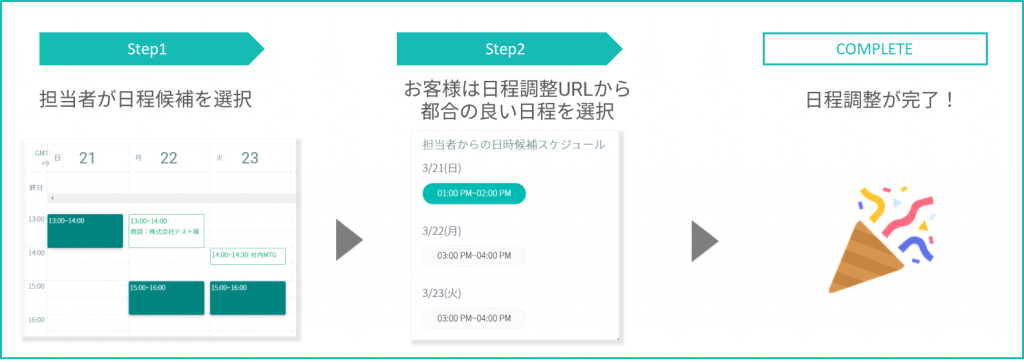その日程調整URLを担当者からお客様に送っていただき、お客様の確認を待ちます。