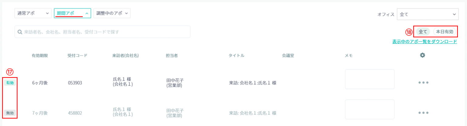 「本日有効」を選ぶと、ステータスが有効で本日が有効期限内の期間アポのみを表示できます。