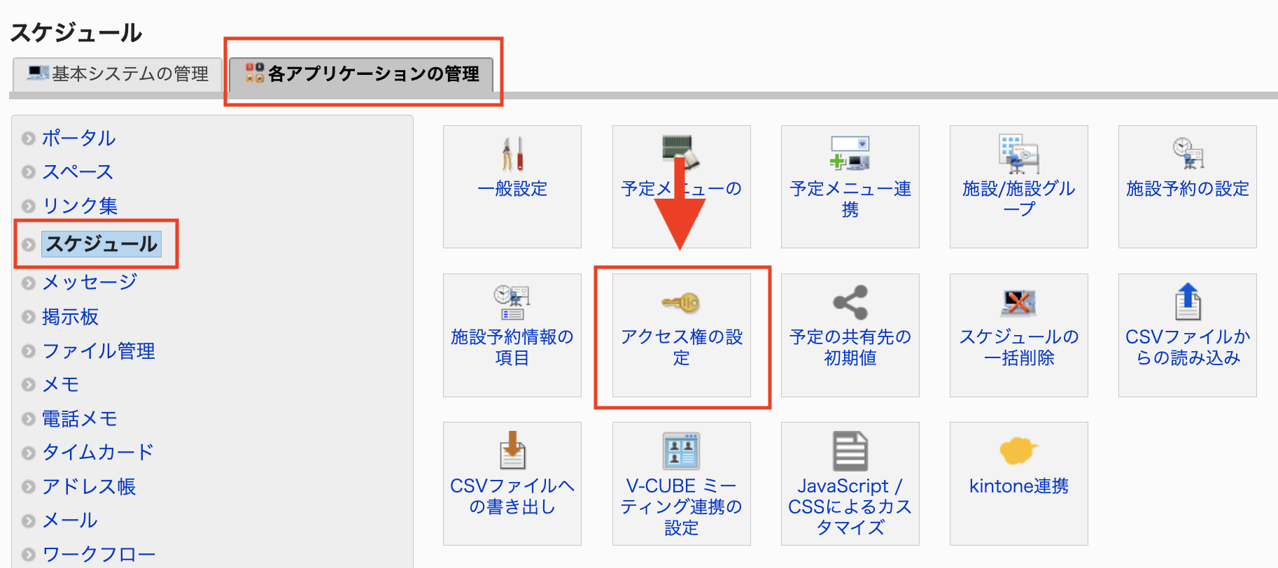 - 画面右上の設定アイコン >「Garoonシステム管理」>「各アプリケーションの管理」>「スケジュール」>「アクセス権の設定」