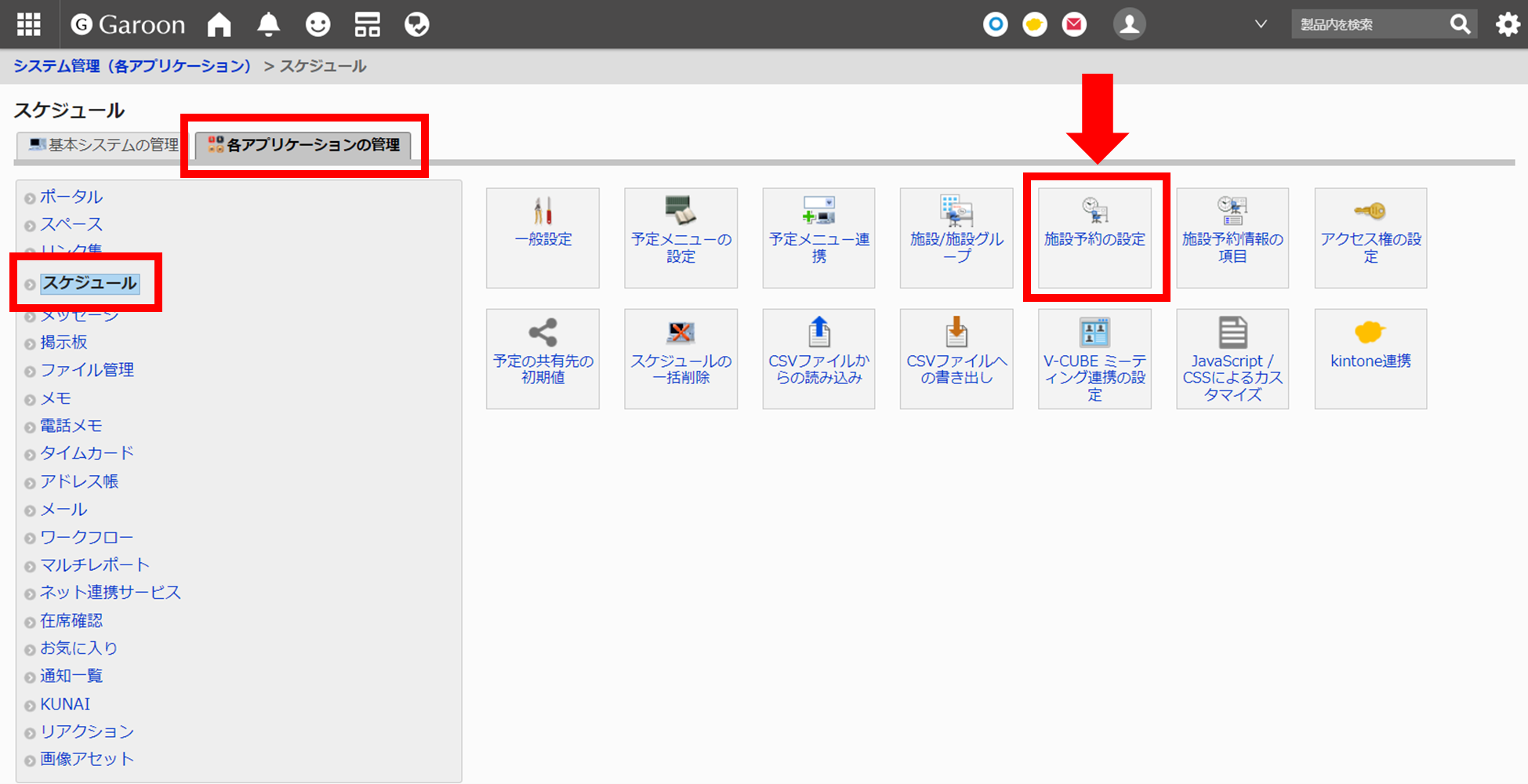 - 画面右上の設定アイコン >「Garoonシステム管理」>「各アプリケーションの管理」>「スケジュール」>「施設予約の設定」