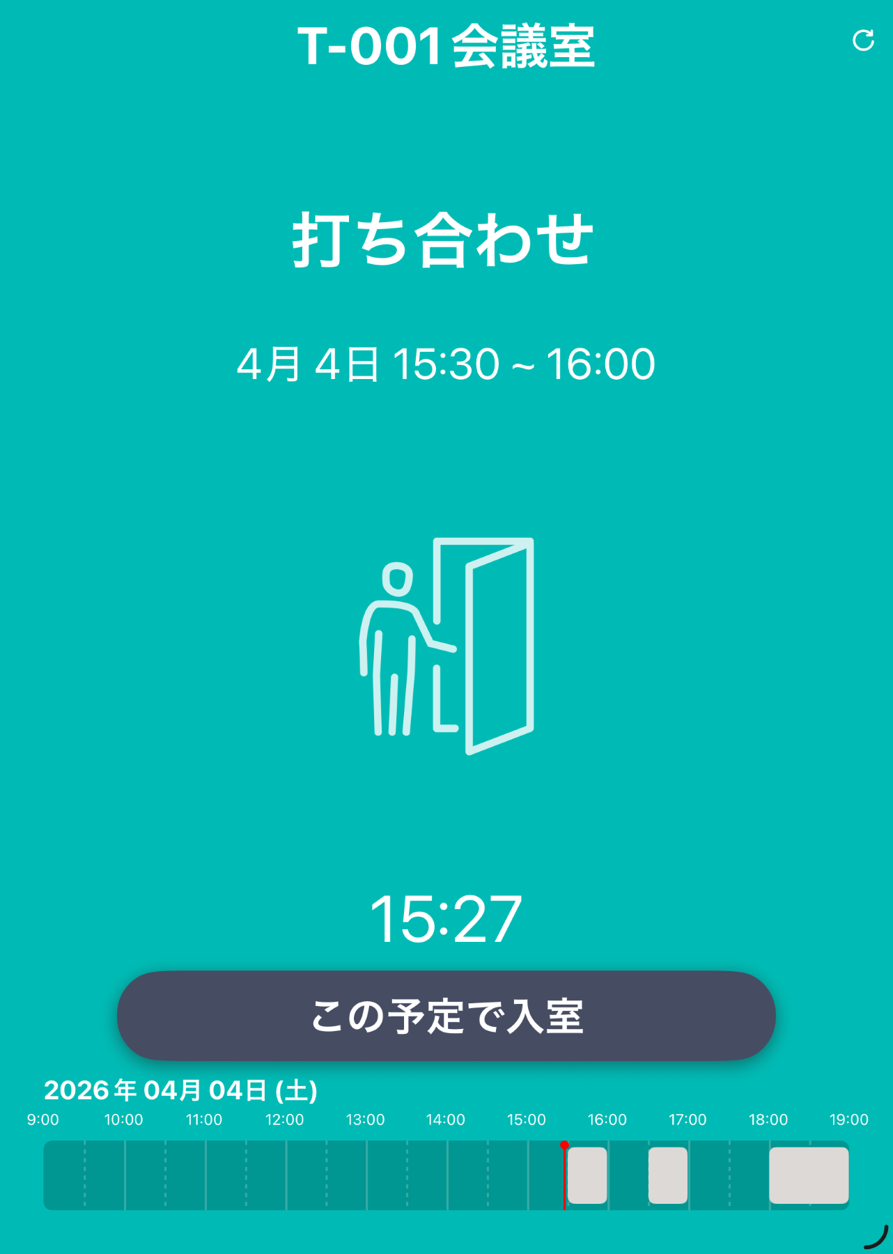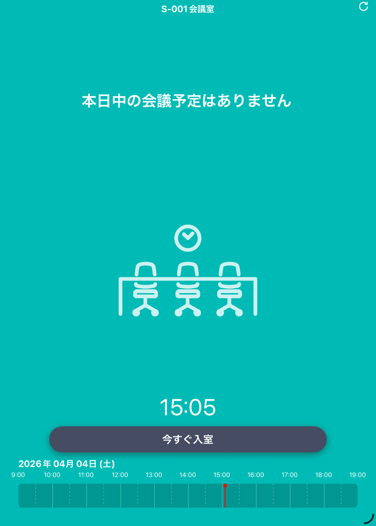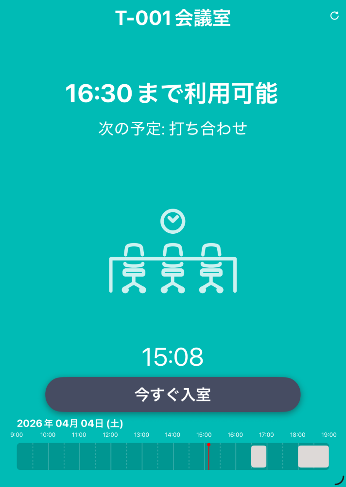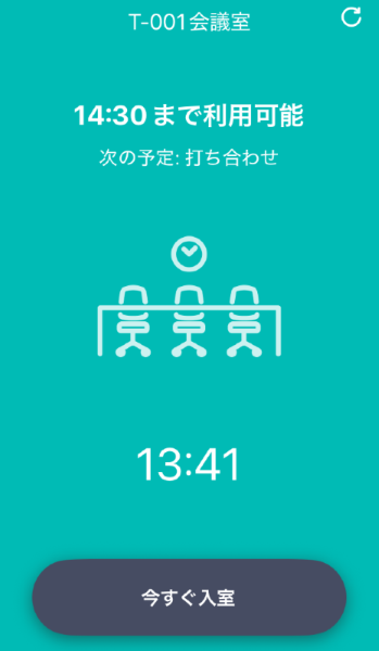 1.入退室モードの端末に、次の予定開始までにご利用が可能な会議室には、端末に「今すぐ入室」が表示されますので、タップします。