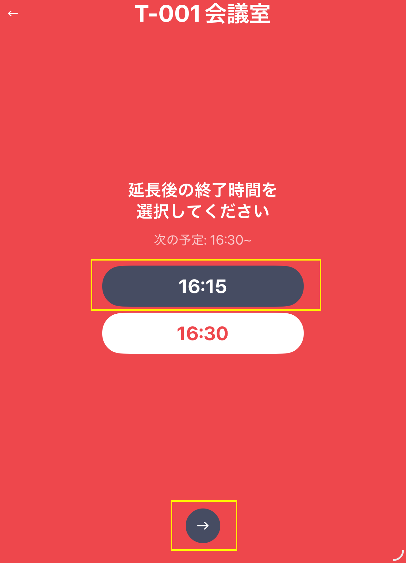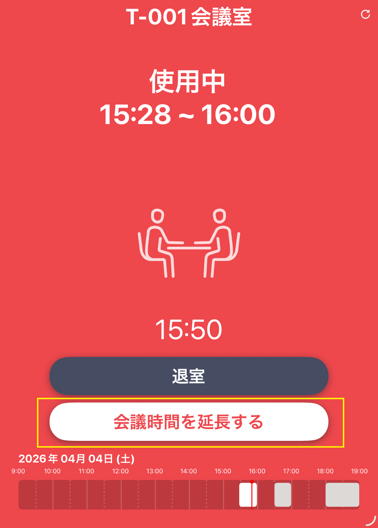 1. 会議の終了時刻から15分以内に予約がない場合は「会議時間を延長する」が表示されますので、タップします。
