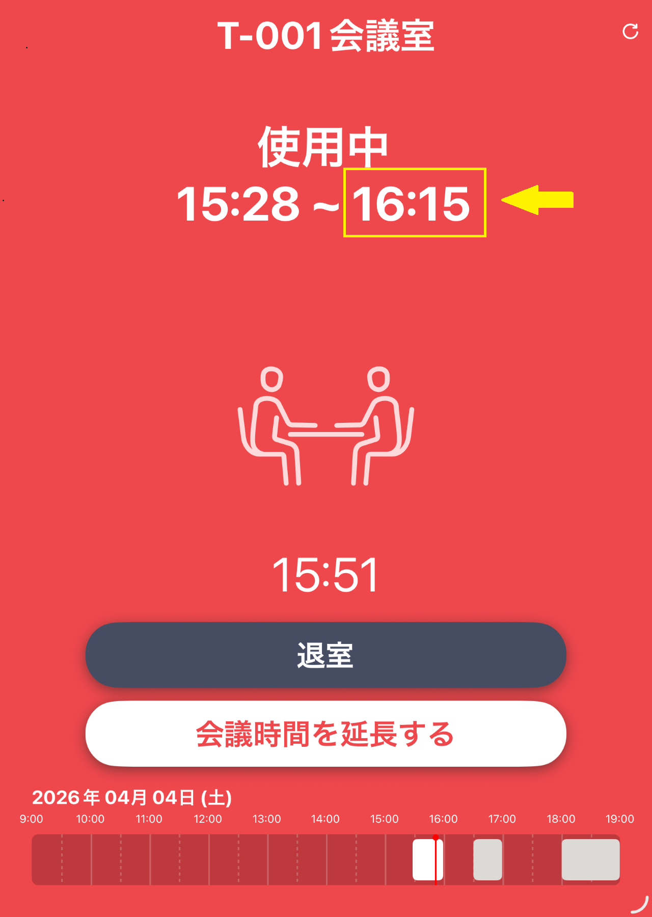 4.予定の終了時間よりも早く退室した場合、連携カレンダー上の終了時間が端末から退室した時間に自動更新されます(自動更新は停止できません)。これにより、退室後から会議室が空き状態になり、新たな予約が入れられます。