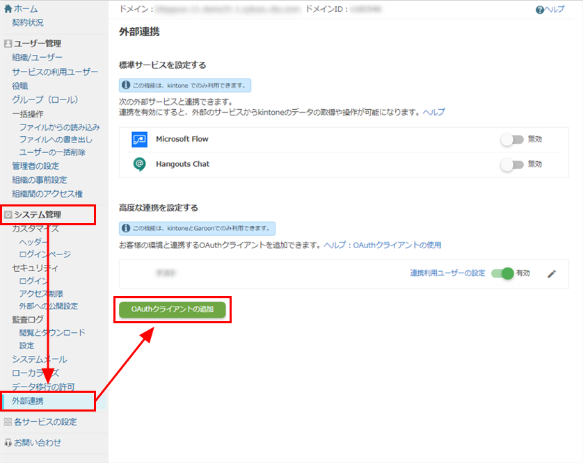 「システム管理」>「外部連携」の「OAuth」>「OAuthクライアントの追加」をクリックします。
