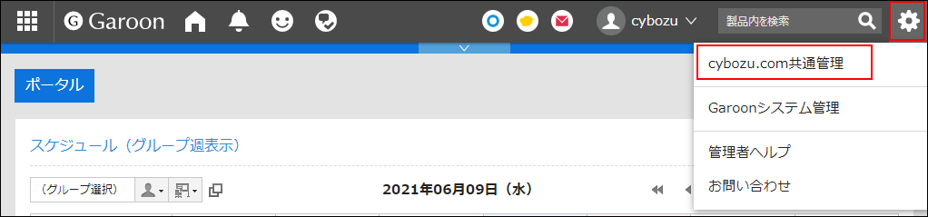 1.Garoon管理者アカウントでログインし、cybozu.com共通管理を開く