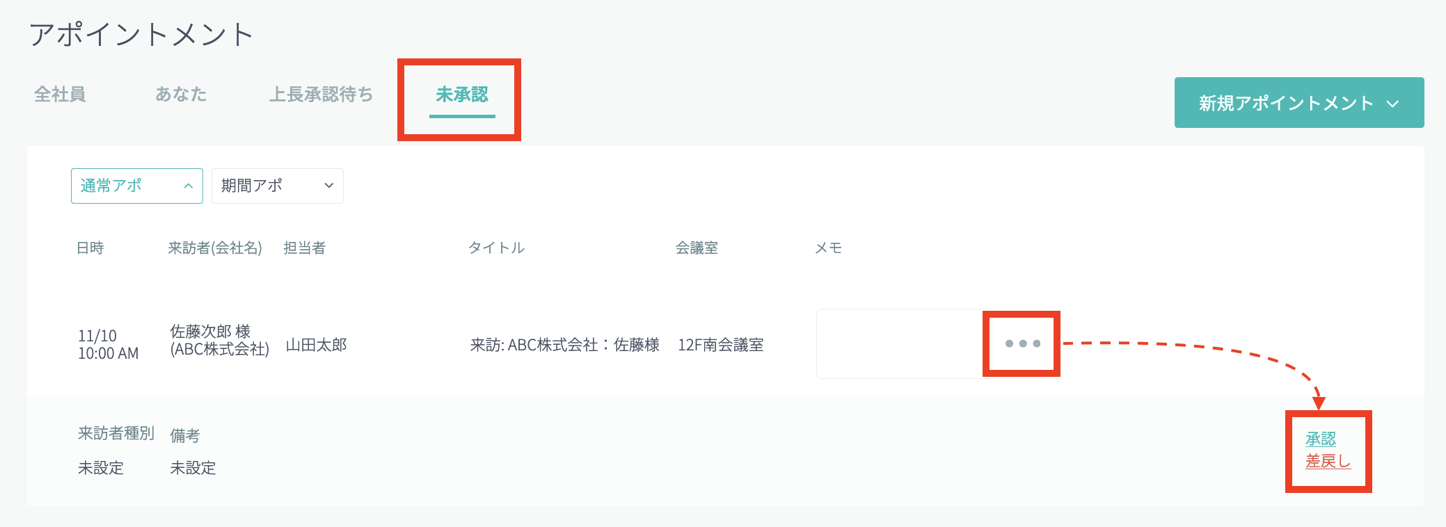 「未承認」タブは、ログインしている社員がアポイントメントの承認者の場合に確認します。