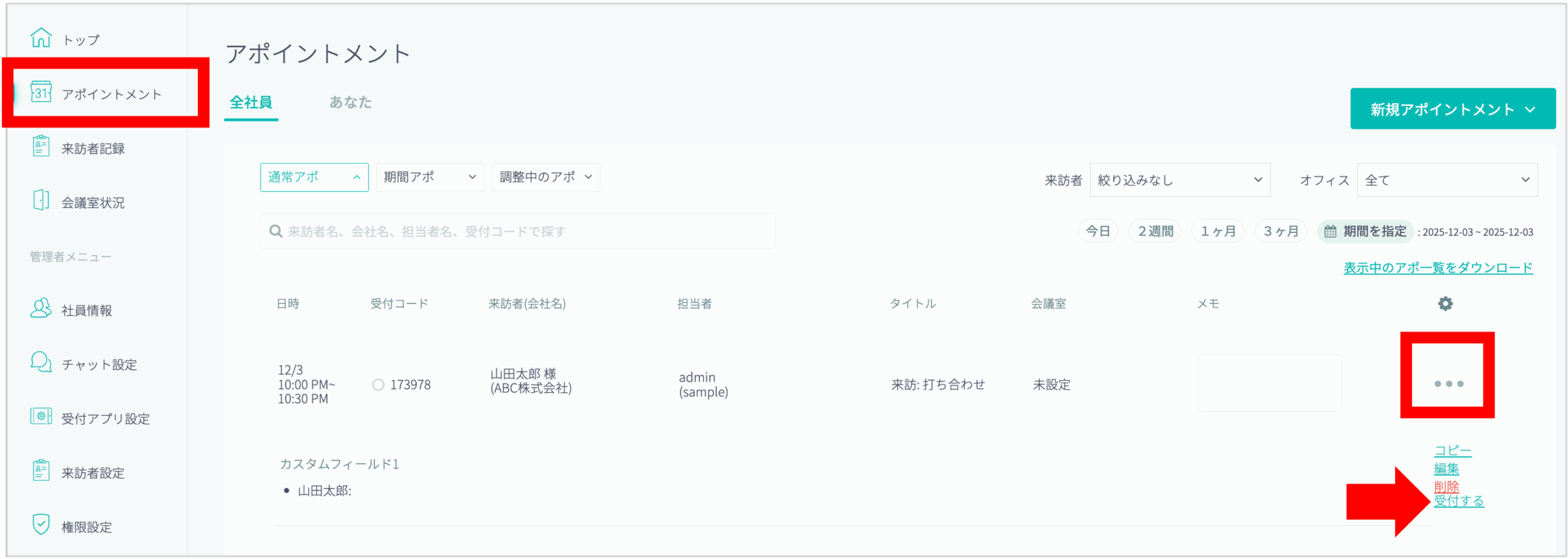 Tips管理者および受付担当者の権限がない社員でも、アポイントメントの担当者となっている場合、そのアポの受付が可能です