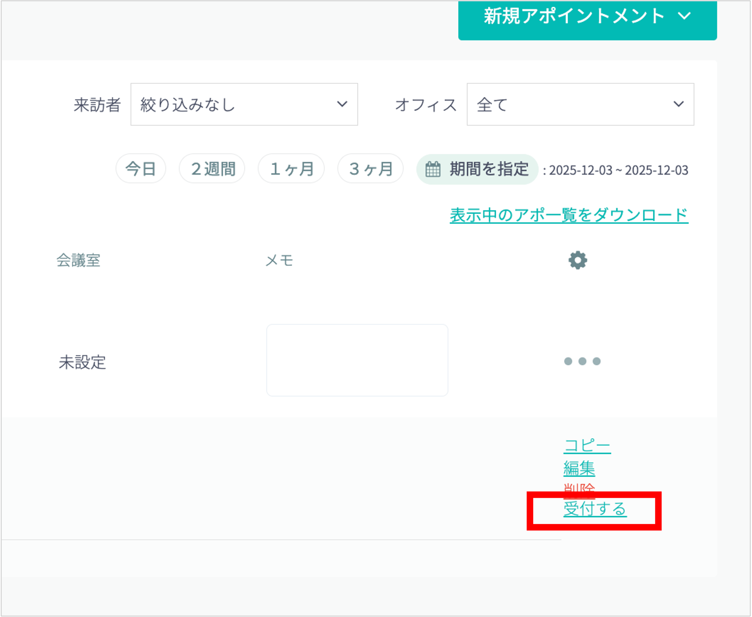 受付コードが発行されるアポイントのみ、管理画面からの受付操作が可能です。