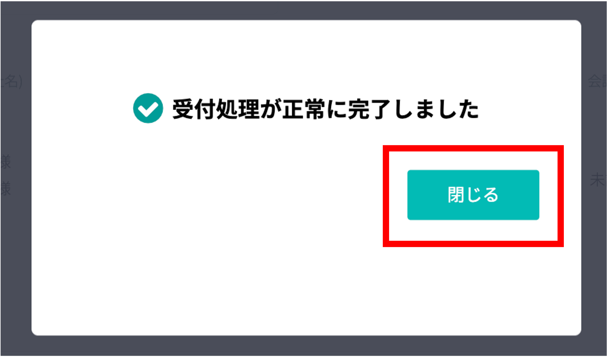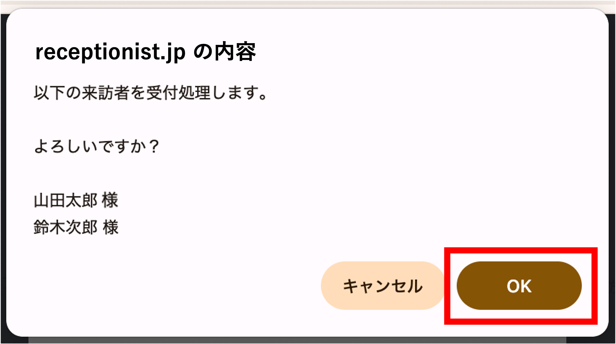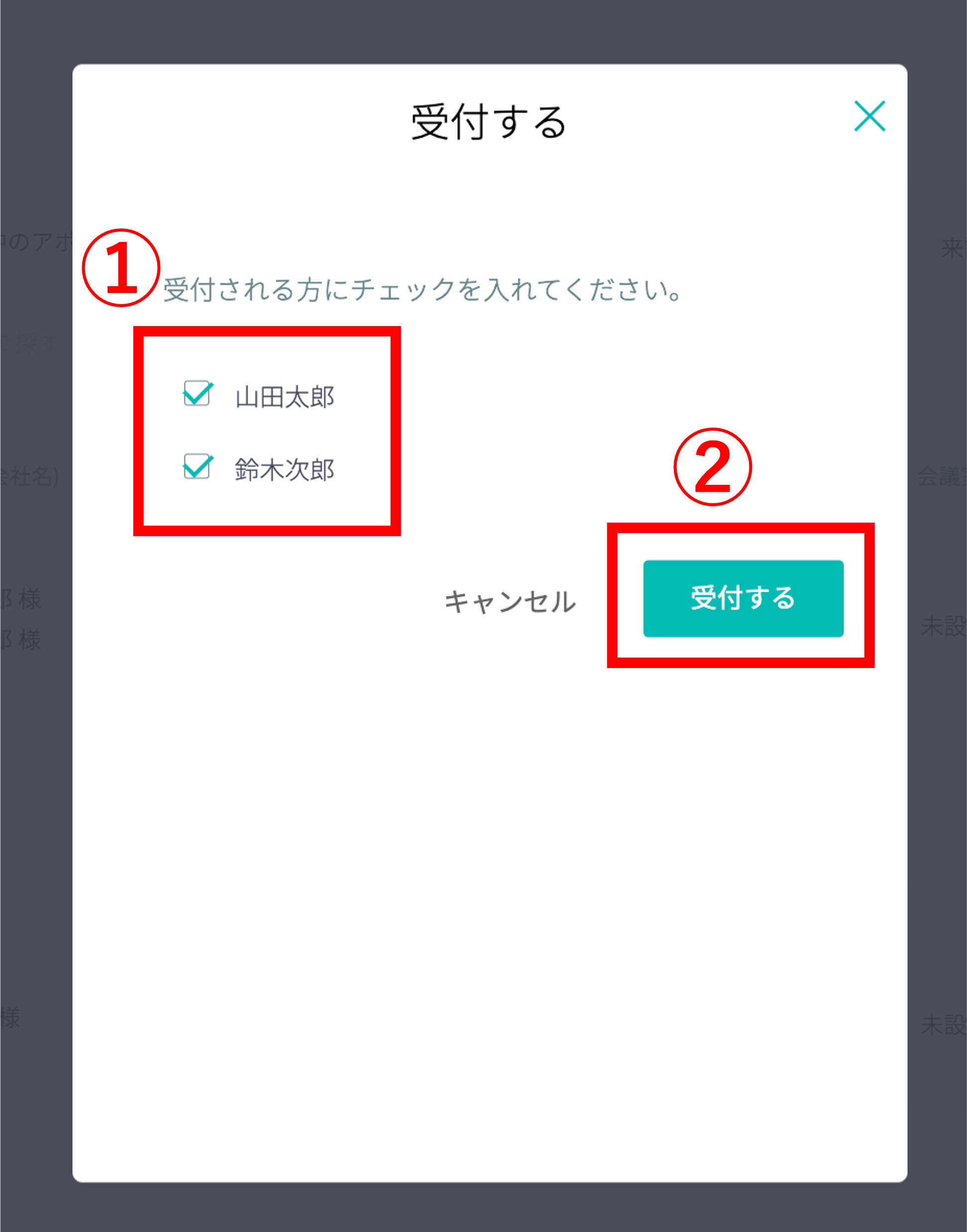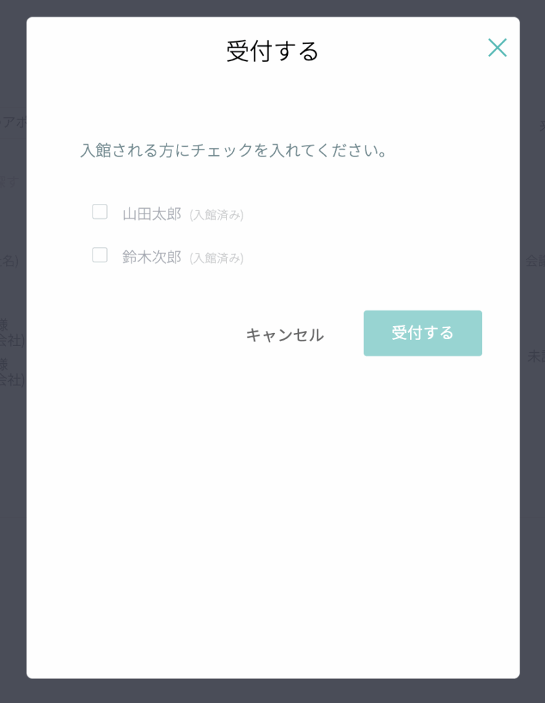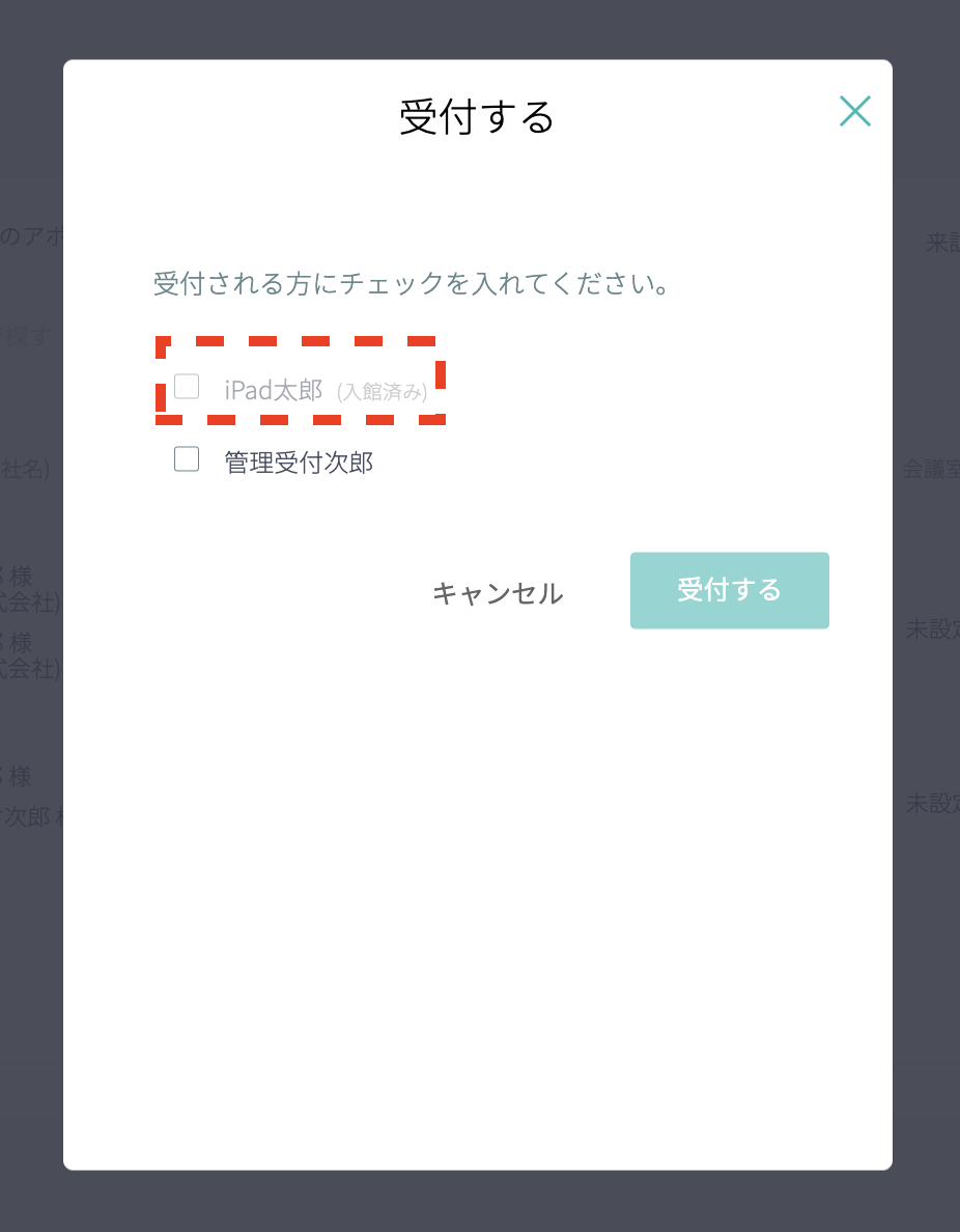 受付アプリ端末で受付済みの来訪者は、「受付する」をクリックした先のモーダルでチェックできず、管理画面からの受付操作はできません。