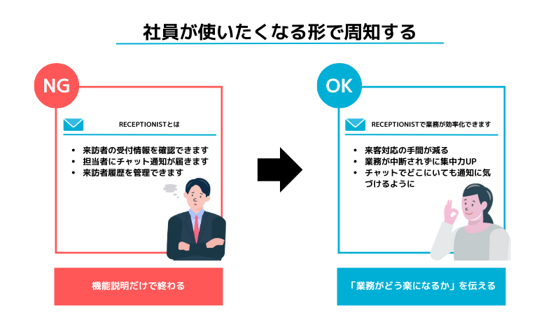 このフェーズでは、RECEPTIONISTを「なぜ使うのか」を社員に理解してもらうことが目的です。