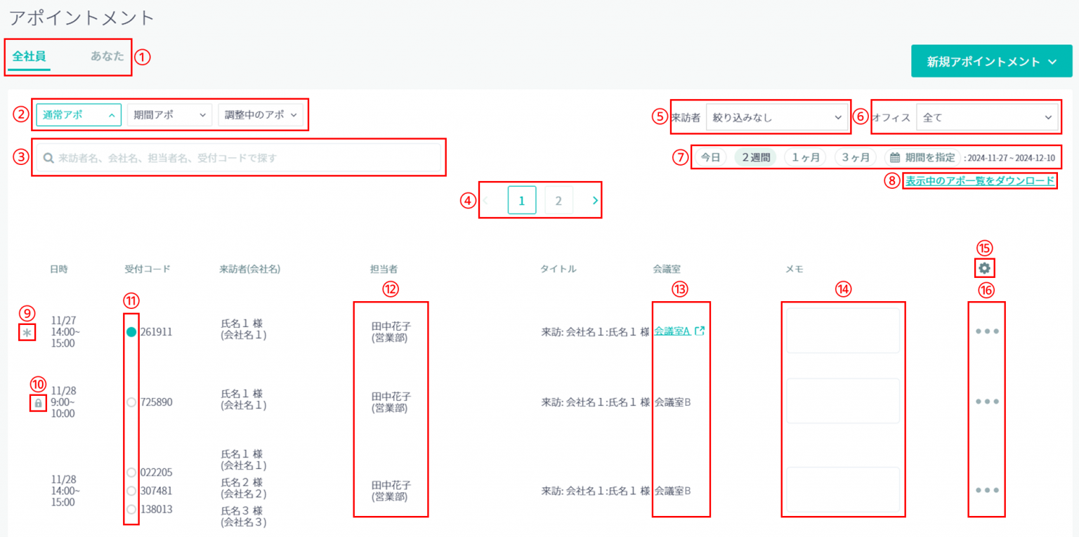 | ① タブ切り替え | 「全社員」と「あなた」で該当のタブを選択しているかご確認ください。 「あなた」を選択した場合、あなたが担当者のアポイントメントのみ表示されます。 |