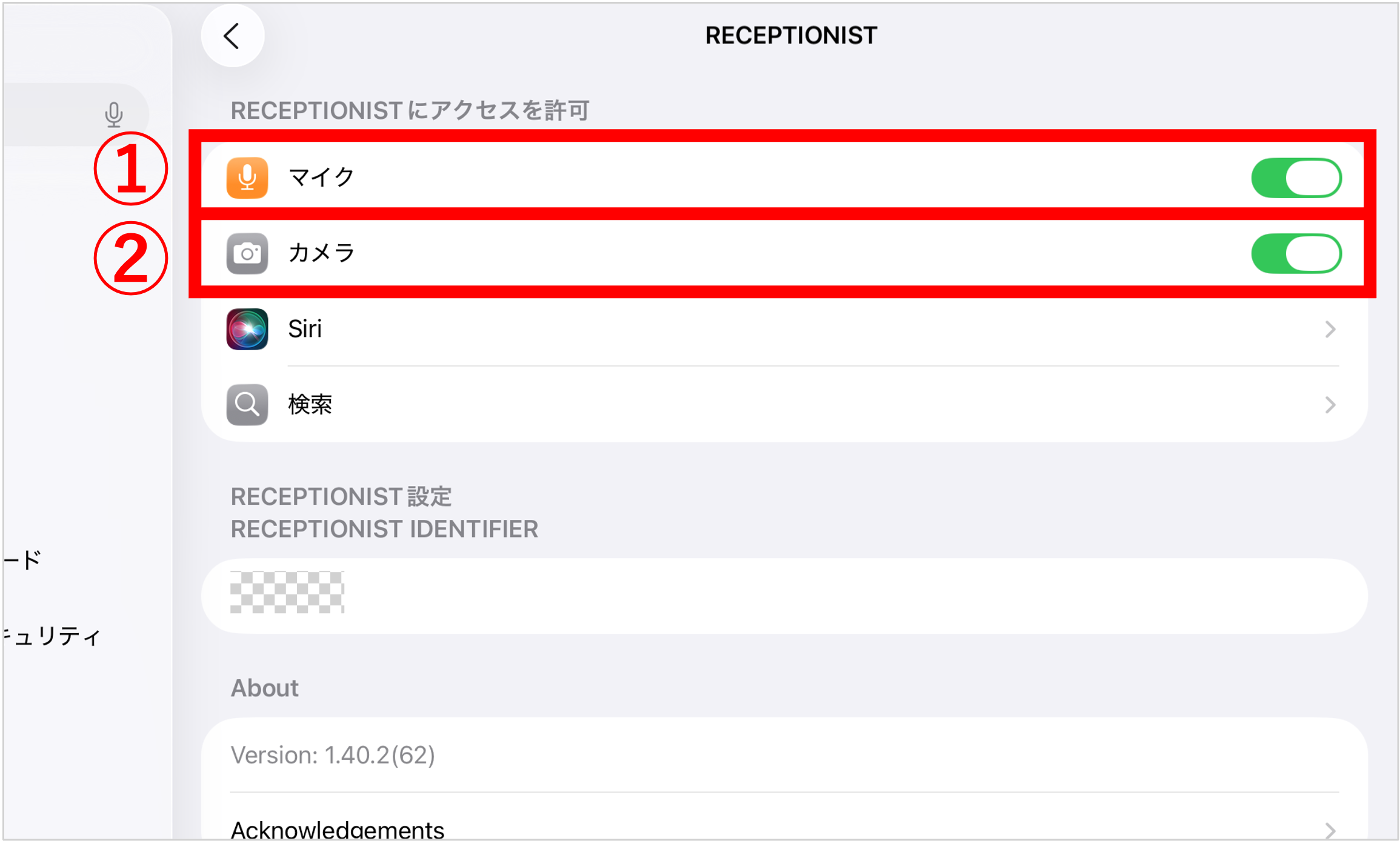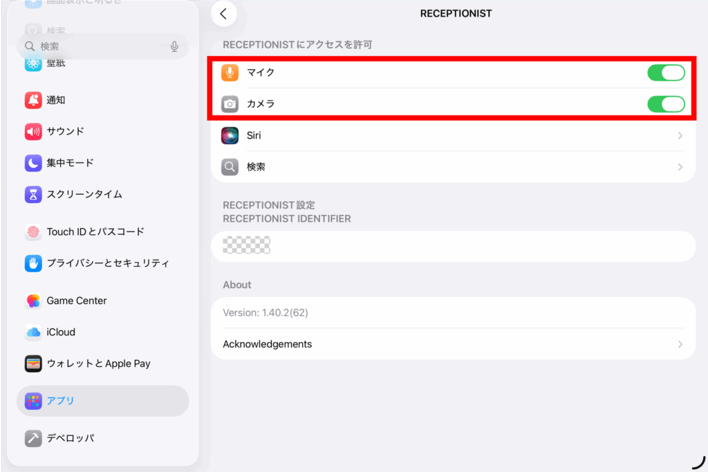 1. iPadの設定>アプリ>「RECEPTIONIST」をタップ