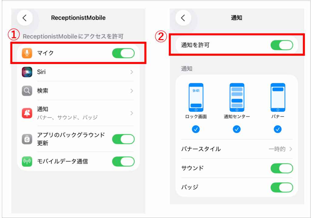初回起動時や、初めてモバイルアプリ通話で受付したタイミングで許可設定が表示した場合には、この時点で「許可」を選択してください。