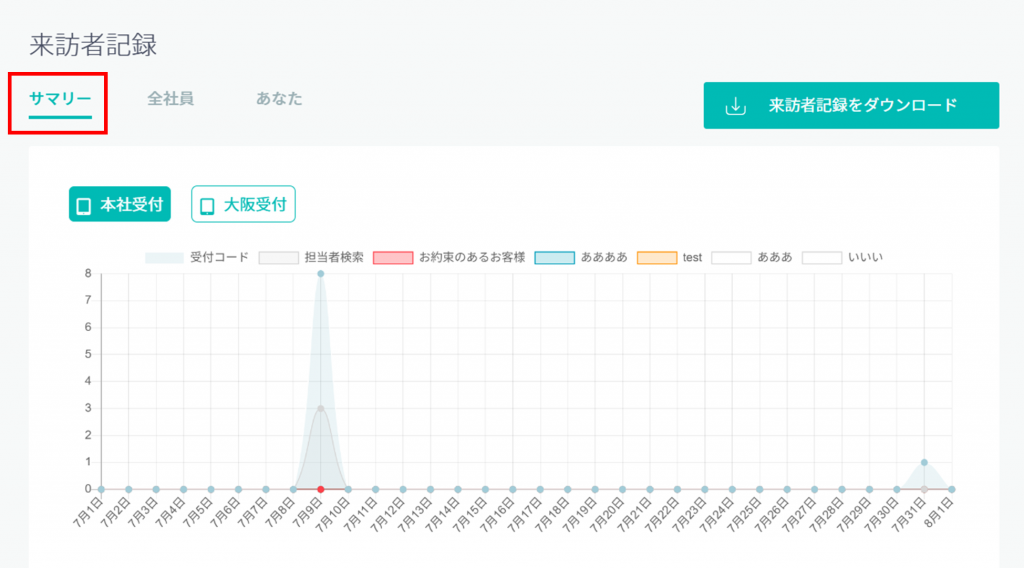 [2025/07/31] 来訪者記録(全社員)の閲覧が不可のとき、サマリーの表示が変更になりました。 2025年7月31日 アップデート日:2025/07/31 権限設定の「来訪者記録(全社員)の閲覧」が不可のとき、 来訪者記録を開いたときの、サマリーの表示が変更になりました。 〔変更前〕 ユーザー権限に関わらず、来訪者記録のサマリーが表示される 〔変更後〕 ・管理者/受付担当者権限:来訪者記録のサマリーが表示される ・上記以外のユーザー権限:来訪者記録のサマリーが非表示になる 関連記事 来訪者記録の管理権限設定 | ヘルプセンター|クラウド受付システムRECEPTIONIST